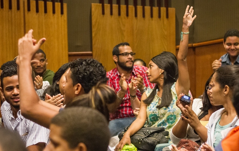 En un abarrotado auditorio Osvaldo García De la Concha, decenas de estudiantes del INTEC participaron en el Diálogo Anual con el Rector Rolando M. Guzmán, en que le presentaron sus propuestas para mejorar su universidad
