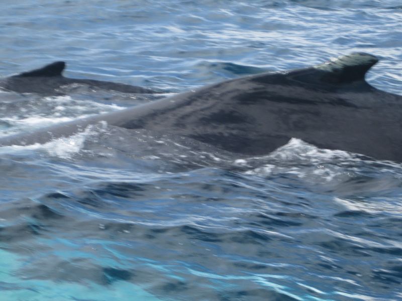 No obstante al mal tiempo que predominaba en aquel día (no salió el sol!!), tuvimos la oportunidad de ir hacia alta mar en dos grandes botes, desde donde nos acercamos a las ballenas jorobadas y verlas a corta distancia. Duramos al menos una hora llegando al punto donde se encontraban las tímidas ballenas (no salían con mucha regularidad). Sin embargo, llegamos a una zona donde pudimos ver no solo una, sino varias ballenas juntas, lo cual fue un excelente momento para fotografiarlas y grabarlas.