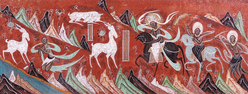 El arte originario de la cueva número 257 de las Grutas de Mogao, en el municipio de Dunhuang, cuenta las vivencias de Sakyamuni, el fundador del budismo, en su vida anterior como un rey ciervo de nueve colores cuando salvó a un hombre que estaba a punto de ahogarse y le pidió que guardara su identidad. Sin embargo, el hombre se ofreció a revelarla cuando el rey de la ciudad le prometió una recompensa a quien lo ayudara a capturar al rey de los ciervos para confeccionar ropa con su pelaje para su esposa, traicionando la confianza del rey ciervo.